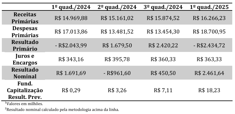 Conforme Tabela 1 as despesas com juros e encargos são superiores ao resultado primário, indicando que o esforço fiscal do Governo foi insuficiente para conter o endividamento. Em relação à evolução da dívida pública, verifica-se que no 2º quadrimestre de 2024 houve redução da dívida consolidada líquida, por consequência, o Resultado Nominal pelo método acima da linha foi um superávit de R$ 2.461,6 milhões.